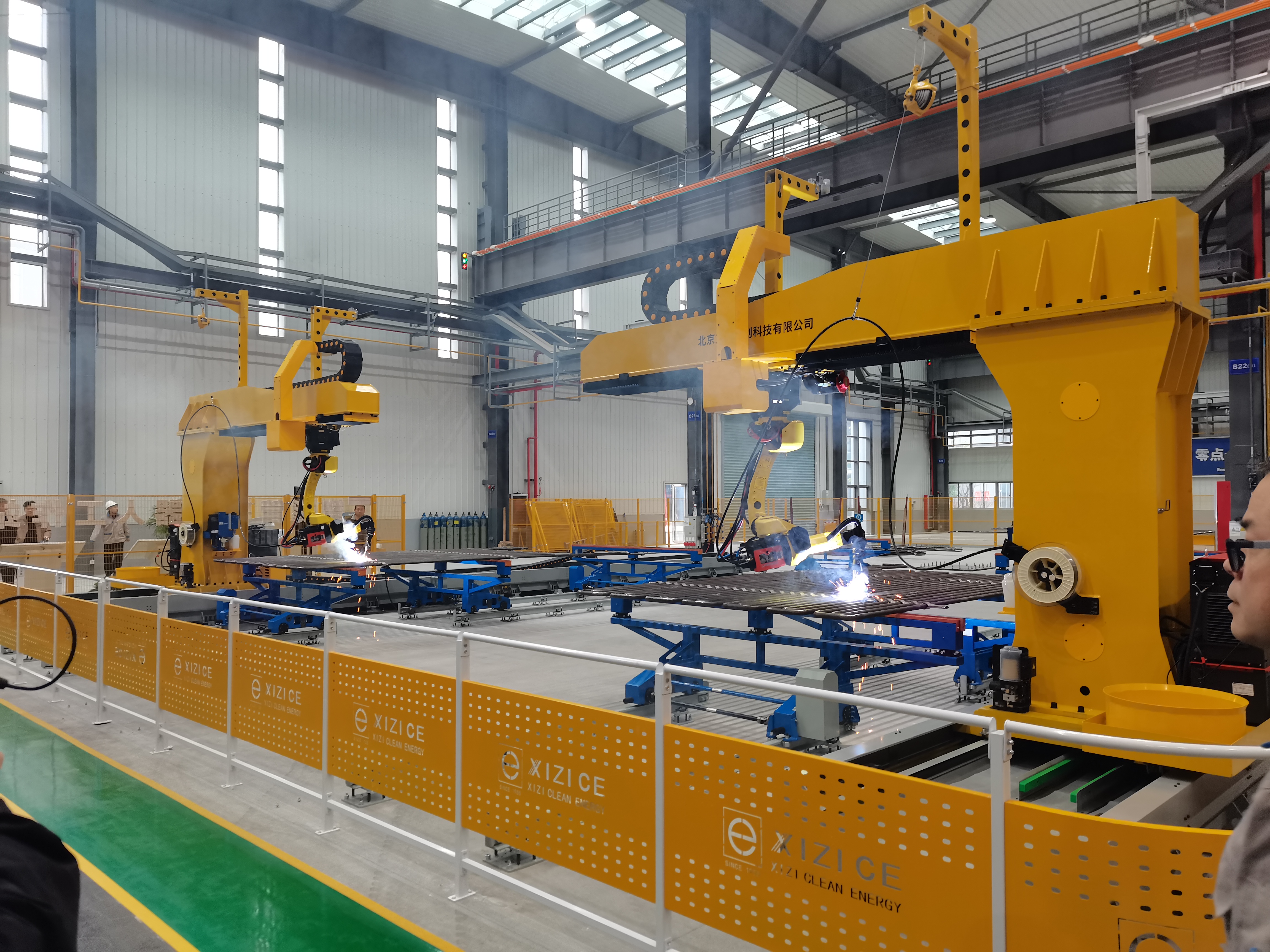 材料端配备立体料库,料库分别与产线连接,通过产线的智能控制实现产线单件流生产;智能蛇形管生产线实现从ATCP管子预处理生产线到管子对接TIG焊接、数字DR无损在线检测再到数控双R弯管的按节拍协同连续作业;膜式壁焊接线上,抛丸处理与拼排焊接整线联动,钢丸与20把焊枪铁水在数控字符串引导下协同起舞,效率质量双提升;管系装配工序,MES系统能灵活调度AGV、机器人,实现自动装配与焊接,以及衔接件等物料的及时精准运送;涂装工序,通过吊挂式自动涂装生产线,实现吊挂式自动物流、自动喷涂、流平、烘干、强冷,废气吸附脱附催化燃烧净化后达标排放。